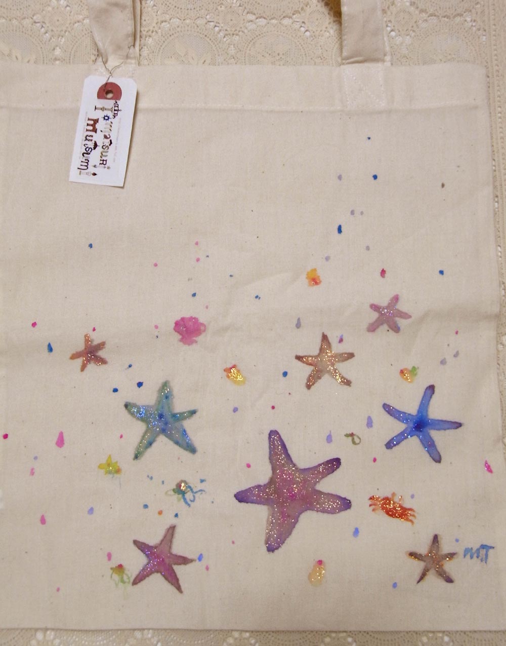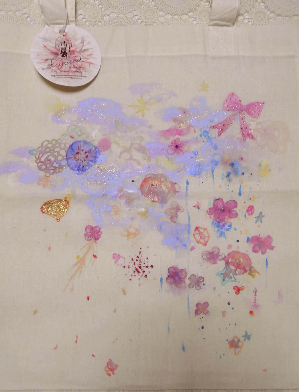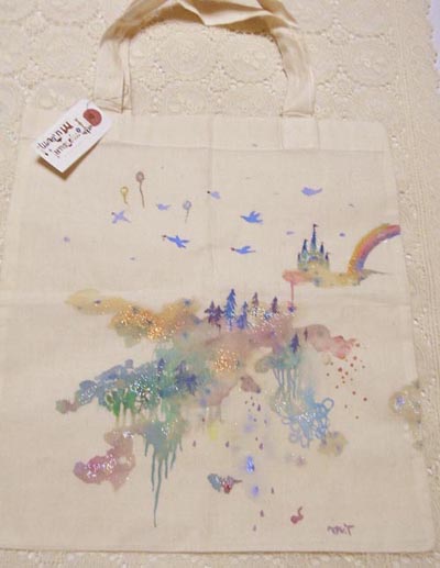 既製のバッグに、耐水性のアクリル絵の具で描いてます。