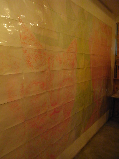 点画のように見えるかと思いきや、実はよく見るとオリジナルのハンコをうすーいティッシュに押して、