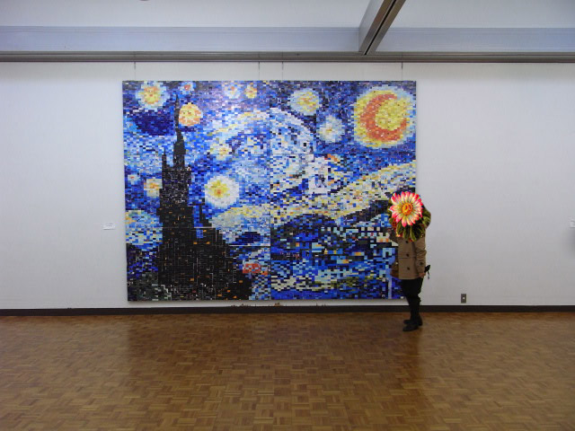 美術部のみんなで色を塗った小さいチップを貼り合わせてつくった思い出の作品。